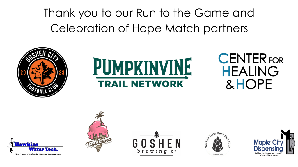 Join us as we Run to the Game and attend the Celebration of Hope Match! Post-match gathering at Goshen Brewing Company!