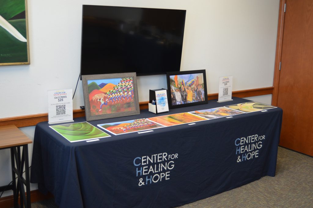 The Voices in Colors for Social Justice exhibit will be on display at Center for Healing & Hope through the end of March. Exhibit hours are Monday-Friday, 8:30am-4:30pm, with the exception of 12:00-1:00pm when the clinic is closed for lunch. We welcome you to come by and see the pieces, each of which is available for purchase with a portion of the proceeds being donated to Center for Healing & Hope. A limited amount of the prints are also still available for purchase at the clinic.