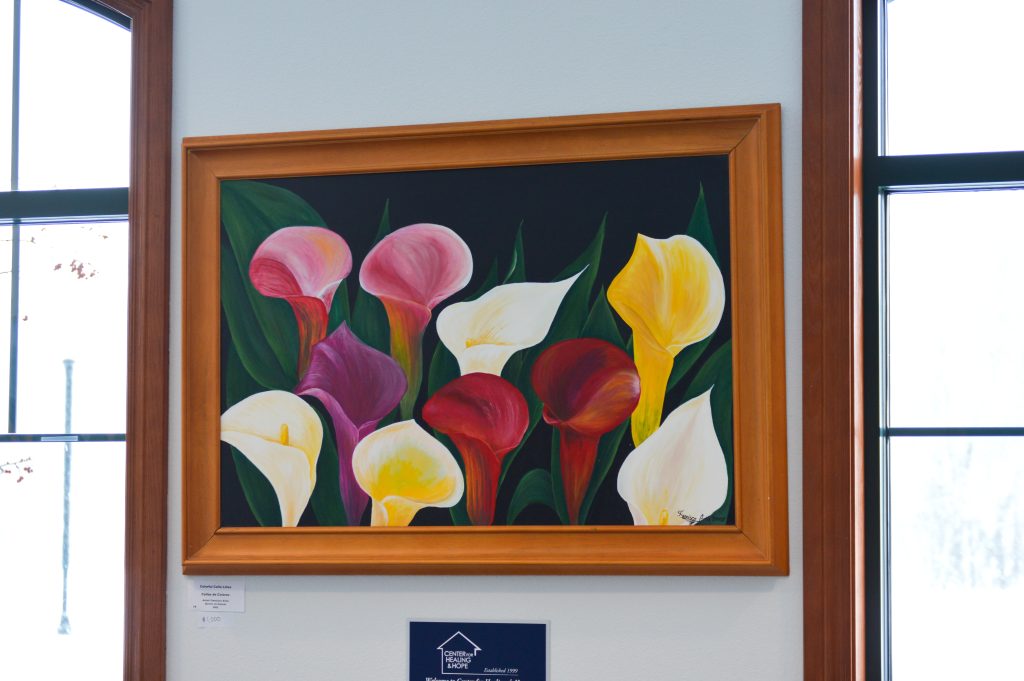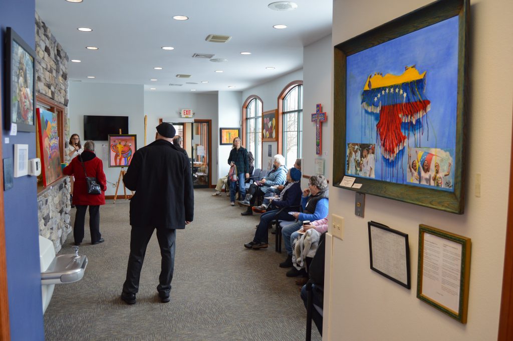 At 3:00pm sharp, the first guest walked in. Someone braved the snow, but surely people in Michiana are used to this weather, right?! Low and behold, more guests arrived. After about 15 minutes, the lobby was comfortably filled with about twenty attendees. Folks walked around lobby visiting with one another, meeting Francisco, and stopping every few feet to study each piece of artwork on display. People were encouraged to make their way into the Interra Cares Education Room where refreshments, additional pieces in the exhibit, and prints available for purchase awaited them.
